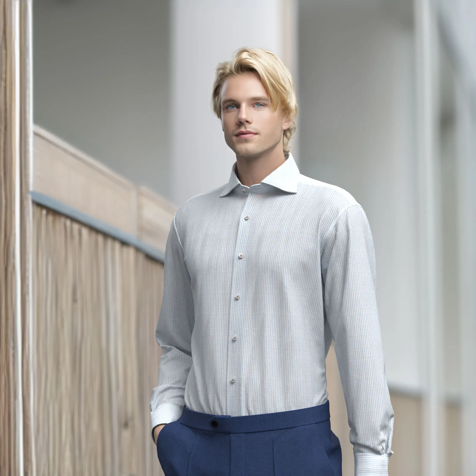 詳細英国の伝統的なファブリックを多く生産しているエイコーンのサックスストライプ・オックスフォード生地です。