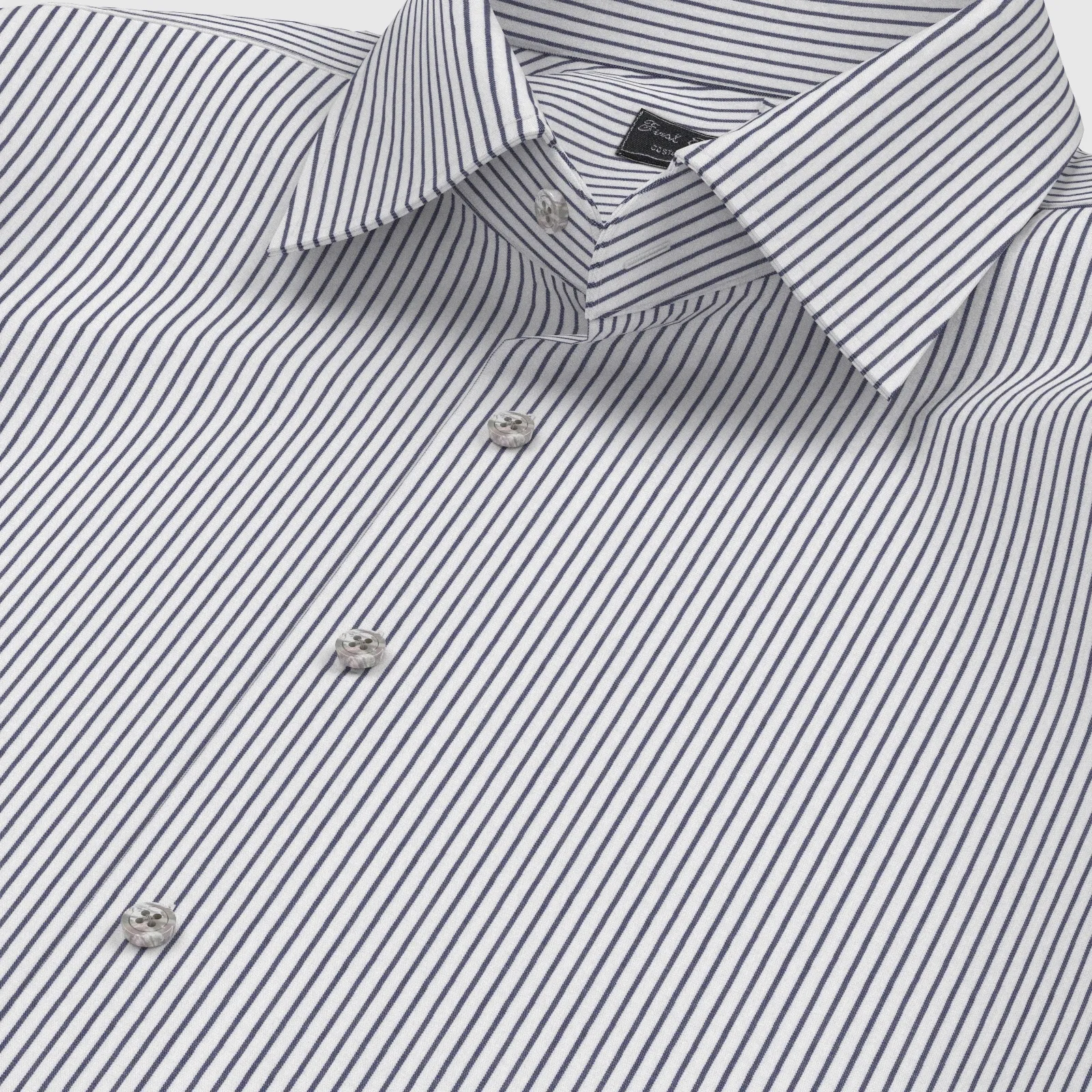 詳細きれいなネイビーの細めストライプの綿100%イージーケア素材です。家庭洗濯+軽いアイロンがけですっきり・きっちりと着こなせる忙しいビジネスマンにぴったりの素材です。肌触りも綿100%の風合いを損なわない着心地です。
