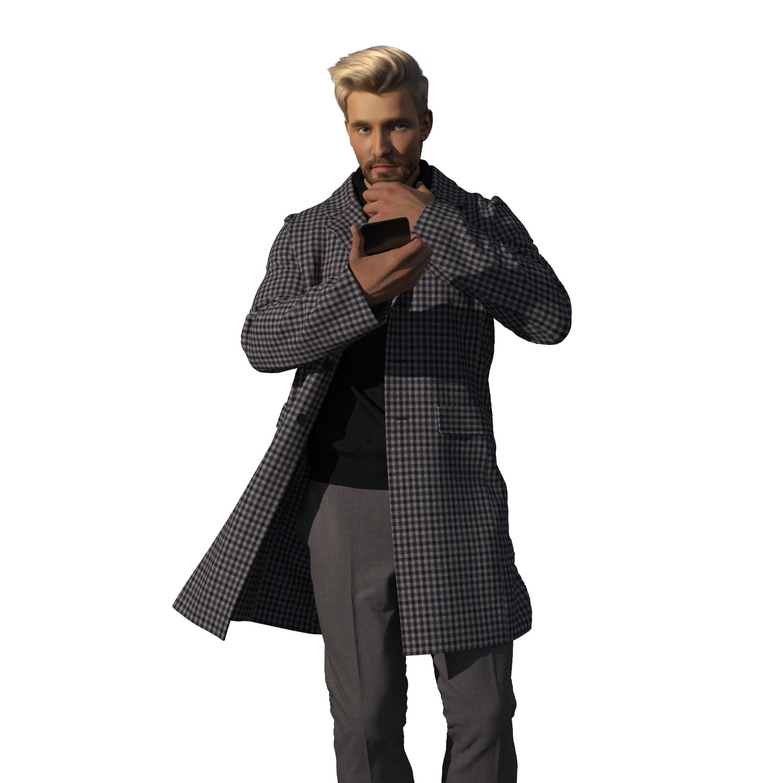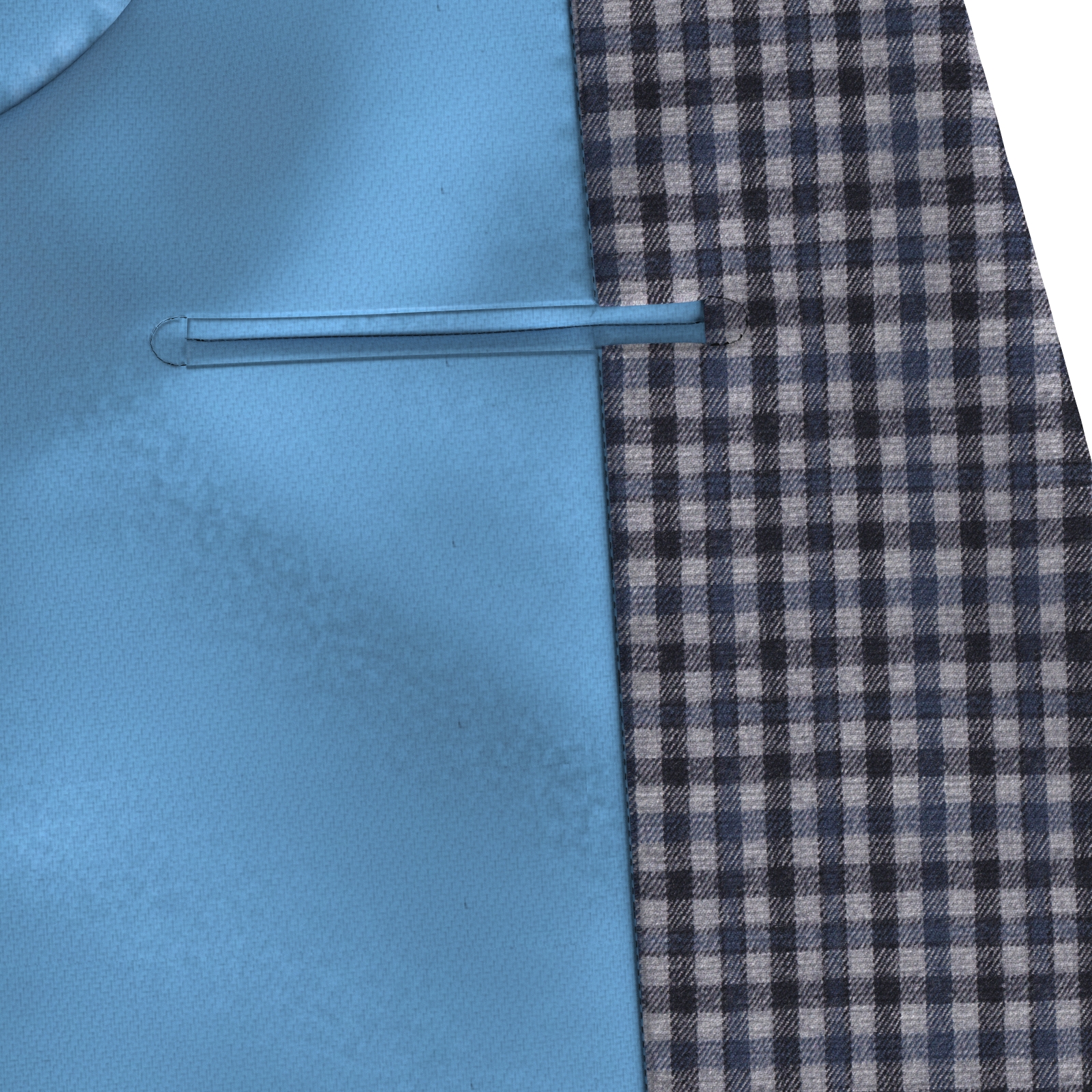 コートとしてはやや薄でで羽織る感じのベーシックで日常使いい最適なストレッチ性のある起毛のグレー・ベースにネイビーとブルーの格子柄生地となります。厚みがあり起毛感のある素材は、秋冬にピッタリです。