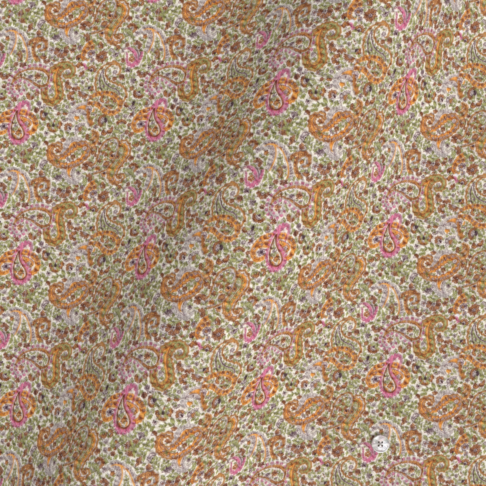 イエロー、ピンク、グリーンなどが配されたマーカス・ペイズリー生地にシュリンク(絞りのようなマイクロウエーブ)加工がされたストレッチ性の高い生地です。